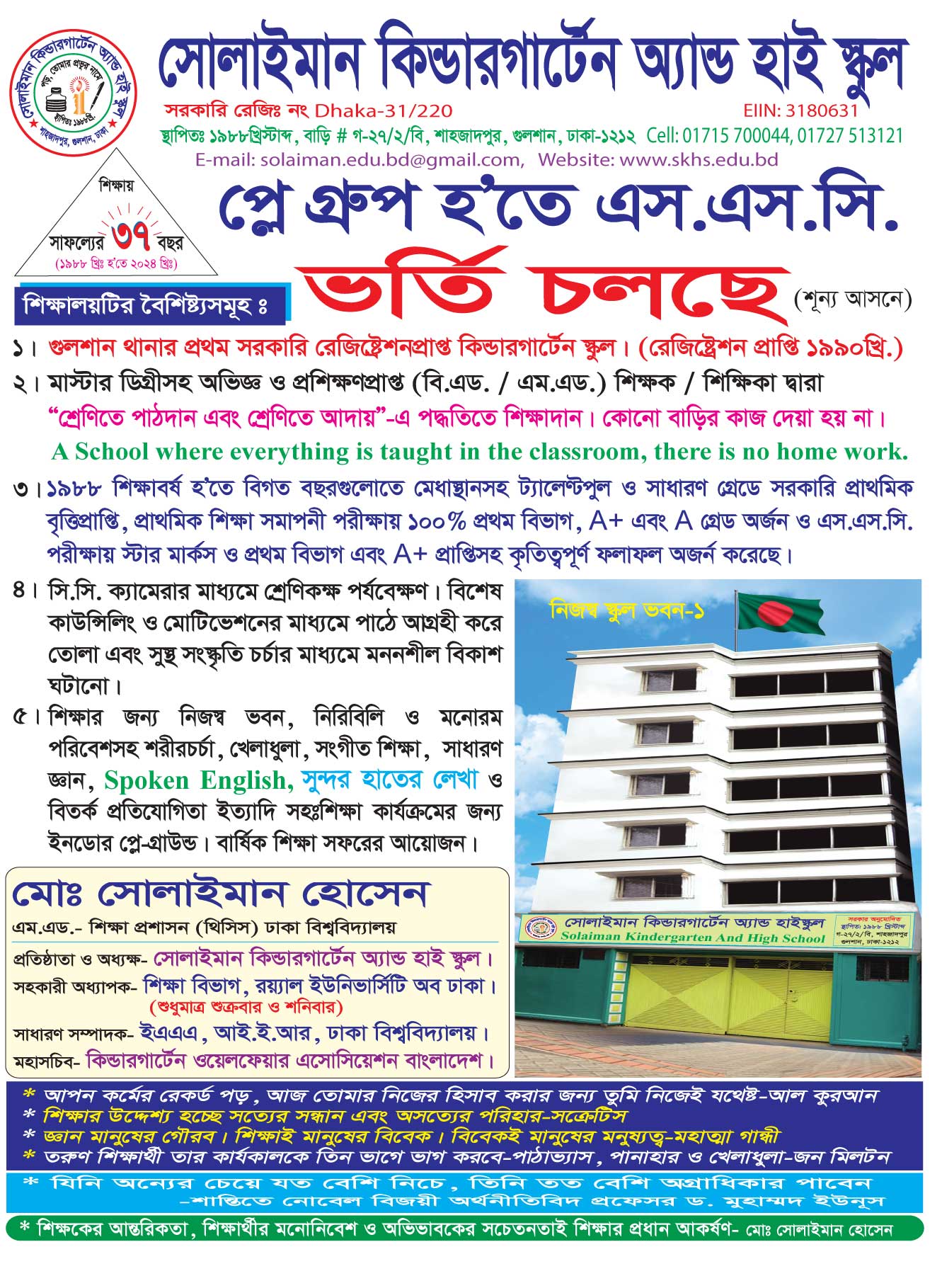 শিক্ষা একটি জাতির আত্ম পরিচয়ের বাহন। যে জাতি যত বেশি শিক্ষিত সভ্যতার ইতিহাসে সেই জাতি তত বেশি উন্নত ও সমৃদ্ধ। একটি দেশকে সার্বিক অগ্রগতির দিকে এগিয়ে নিতে শিক্ষা হচ্ছে মৌলিক, শিক্ষা হচ্ছে পূর্বশর্ত। প্রতিযোগিতামূলক বিশ্বে আমাদেরকে সভ্য ও সমৃদ্ধ জাতি হিসেবে প্রতিষ্ঠিত করতে শিক্ষার কোনো বিকল্প নেই। শিক্ষার স¤প্রসারণ ও গুণগত মানোন্নয়ন আমাদের সমাজ, জাতি তথা দেশকে উন্নতি ও সমৃদ্ধির শীর্ষে পৌঁছে দিতে পারে। এ লক্ষ্যকে সামনে রেখে ১৯৮৮ খ্রিস্টাব্দে রাজধানী ঢাকার গুলশান থানাধীন শাহ্জাদপুরে প্রতিষ্ঠা করি সোলাইমান কিন্ডারগার্টেন নামের বিদ্যাপীঠটি। ১৯৮৮ ও ১৯৮৯ খ্রিস্টাব্দে স্কুলটি সাফল্যের সাথে পরিচালিত হওয়ায় ১৯৯০ খ্রিস্টাব্দে গণপ্রজাতন্ত্রী বাংলাদেশ সরকারের দৃষ্টি আকৃষ্ট হয় এ স্কুলটির প্রতি। সরকার ১৯৯০ খ্রিস্টাব্দে গুলশান থানার কিন্ডারগার্টেন ও সমমানের স্কুলসমূহের মধ্য হ’তে সর্বপ্রথম সোলাইমান কিন্ডারগার্টেনকে অনুমোদন দেন। ১৯৮৮ খ্রিস্টাব্দ হ’তে বিগত বছরগুলোতে মেধাস্থানসহ ট্যালেন্টপুল ও সাধারণ গ্রেডে সরকারি প্রাথমিক বৃত্তিপ্রাপ্তি, প্রাথমিক শিক্ষা সমাপনী পরীক্ষায় ১০০% প্রথম বিভাগ, এ+ এবং এ গ্রেড অর্জন ও এস.এস.সি. পরীক্ষায় স্টার মার্কস ও প্রথম বিভাগ এবং এ+ প্রাপ্তিসহ কৃতিত্বপূর্ণ ফলাফল অর্জন করেছে। আমি দৃঢ়ভাবে বিশ্বাস করি শিক্ষাদান ও শিক্ষাগ্রহণ কার্যক্রমকে অধিক ফলপ্রসূ ও সফল করার জন্য শিক্ষকের আন্তরিকতা, শিক্ষার্থীর মনোনিবেশ ও অভিভাবকের সচেতনতার গুরুত্ব অপরিসীম। সকলের ঐকান্তিক ও সার্বিক সহযোগিতা আমাদের অব্যাহত প্রচেষ্টাকে সবসময় গতিশীল রাখবে এ প্রত্যাশা আমার একান্ত হৃদয়ের।